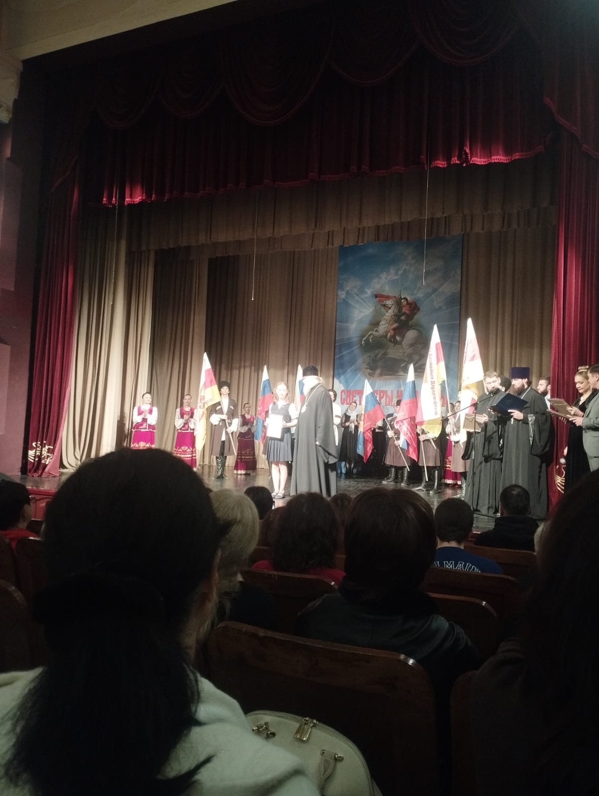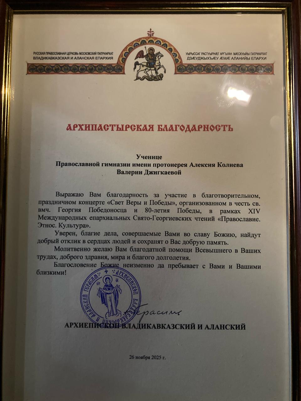 Учащаяся 9 класса Джигкаева Валерия приняла участие в праздничном концерте «Свет Веры и Победы». Концерт был организован Владикавказской и Аланской епархией в честь св. вмч. Георгия Победоносца и к 80-летию Победы.